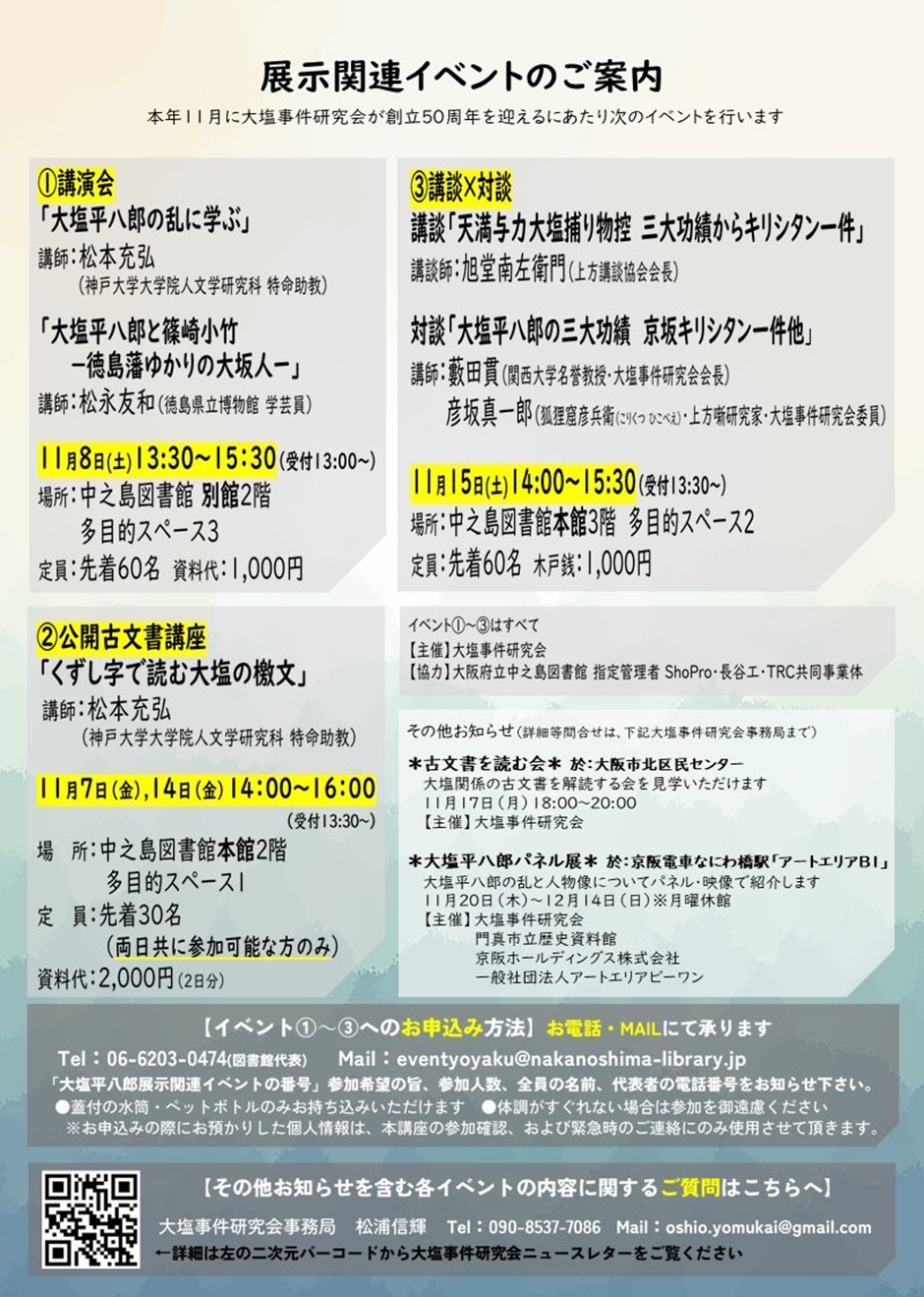 「大塩平八郎展示関連イベントの番号」参加希望の旨、参加人数、全員の名前、代表者の電話番号をお知らせください。